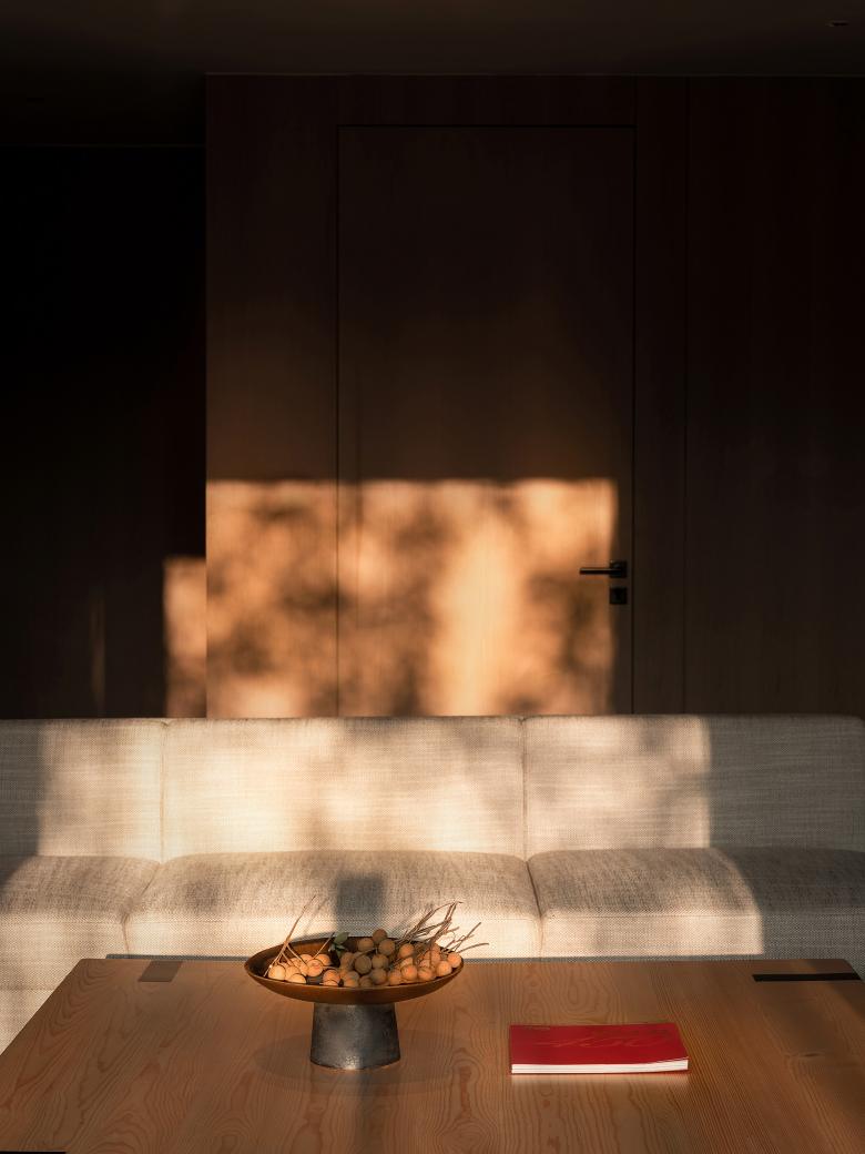 By skillfully utilizing natural materials, elegant tones and interplay of light and shadow, the interior space seamlessly blends with the outdoor landscape. The artworks in the interior retain a natural touch and warmth, allowing the traces of time to add character to the space.