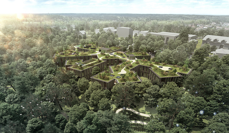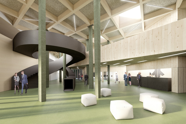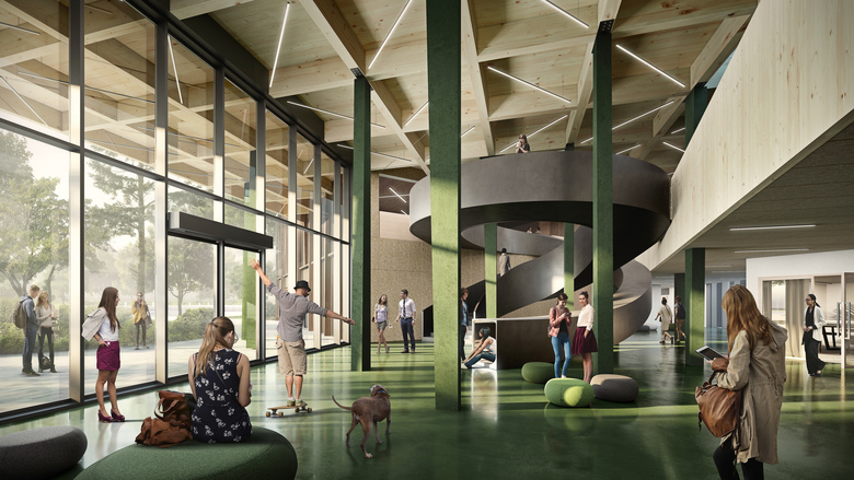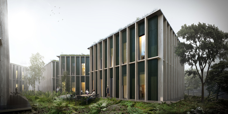It is illustrative of the forest as a workplace, making the connection between the two as seamless as possible through heavy use of transparent elements in the structure, so as to accentuate the surrounding environment from the inside. This led to the formation of a central space from which the building branches out into a forest, and the forest back into the building.