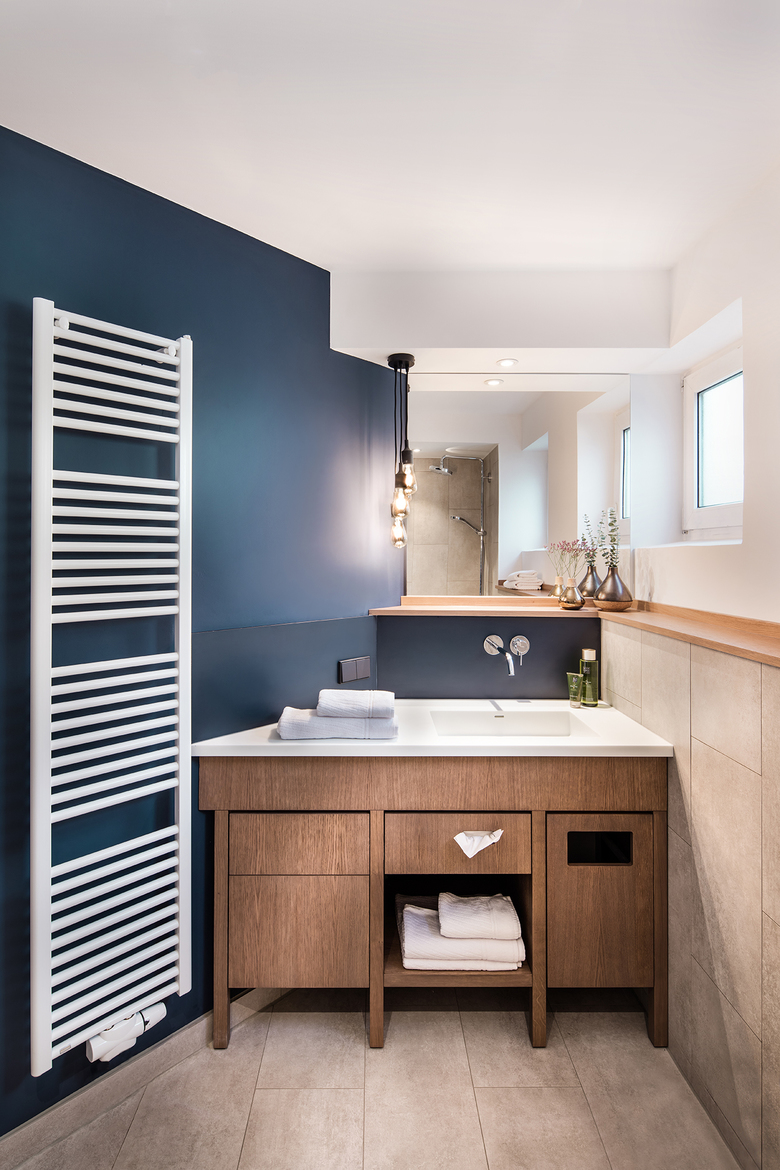Im Hotelzimmer wird deutlich: Wohnlichkeit und Moderne wirken im Gesamten und zeigen sich im Detail. Weiche Textilien und runde Formen stehen einer klaren Liniensprache und gastfreundlicher Funktionalität gegenüber. Letztere zeigt sich beispielhaft im multifunktionalen Kleiderschrank, der zudem als Sitznische und Kofferablage genutzt werden kann. Seine Formensprache ist filigran und geometrisch. Die indirekte Beleuchtung schafft Gemütlichkeit und ist variabel einstellbar – je nach Bedürfnis des Gastes. Liebevolle Details wie die Nachttischleuchte in Pendelform, Lederlaschen in der Sitznische oder Ziernähte am Bettrücken runden das Konzept ab.
