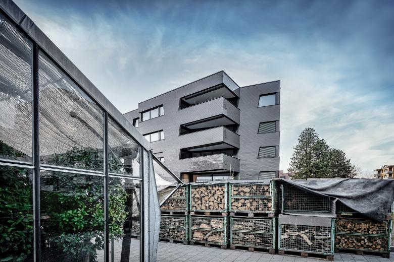 Die Fassaden mit den Eckfenstern lockern die einzelnen Baukörper auf und verleihen der gesamten Wohnanlage eine fein-gliedrige Struktur. Die dunklen keramischen Platten und deren Spiegeleffekt verleihen dem Volumen Leichtigkeit und eine elegante Erscheinung.
