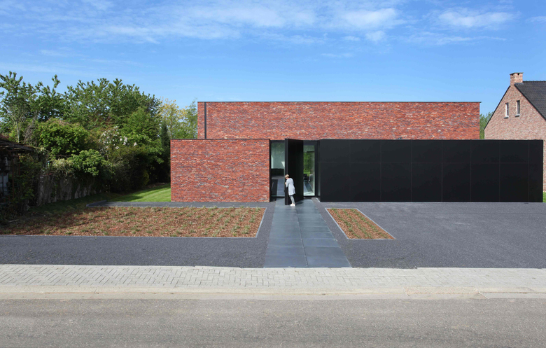 Het landschap biedt zich binnen de woning aan als een schilderij. Een geïntegreerd overdekt terras vormt de schakel tussen de buitenkamer en de leefruimtes. In schril contrast met de landschappelijke betrokkenheid wordt de woning ‘afgesloten’ van de straat door middel van een afsluitbare pivoterende poort. Een pastorijwoning wordt de spiegel voorgehouden. Vanuit het inkomgedeelte krijgt men zicht op de patiotuin die gekoppeld wordt op de spreekkamer van Acad’Emo. Kasten laten ruimtes in mekaar overlopen. Zo wordt de vestiaire, de eet- en keukenkast samen met de deuren naar de berging en de garage als één kastenwand vormgegeven. Bovenlicht geeft de transparante badkamer een weelde van licht. Dit bovenlicht geeft het eiland in de keuken ander licht. De recht-toe-recht- aan trap splitst de logeerkamer op het gelijkvloers af van de zitkamer. Vanuit de bureauruimte op de verdieping kijkt men over de trap op het weids landschap. Houtaccenten doorbreken het gewenste zwart-wit contrast.