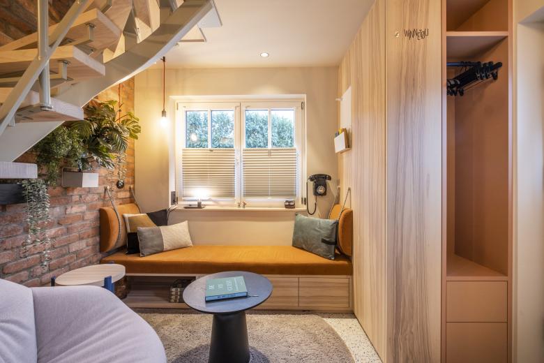 Als Teil eines Hotelgeländes sollte ein winziges, am besten das kleinste Hotel der Welt entstehen. Angeschaut haben wir uns ein altes Trafohäuschen auf dem Hotelareal. 17 qm groß, 3 Ebenen – also nichtmal 6 qm Grundfläche. Sorry – kleiner ging’s dann wirklich nicht mehr. Im Trafohaus sollte nun also ein Hotelzimmer entstehen, dass allen Anforderungen und allem Komfort eines Hotels gerecht wird. Gleichzeitiges Arbeiten von mehreren Gewerken: gar nicht möglich, beim Einbau der Treppen wurde es besonders delikat und dann war da noch unsere Vision, Gäste unterm Sternenhimmel schlafen zu lassen. Für etwas so winzig Kleines also ein ziemlich großer Aufwand, der sich aber mehr als gelohnt hat, wenn man die Räume heute betritt.