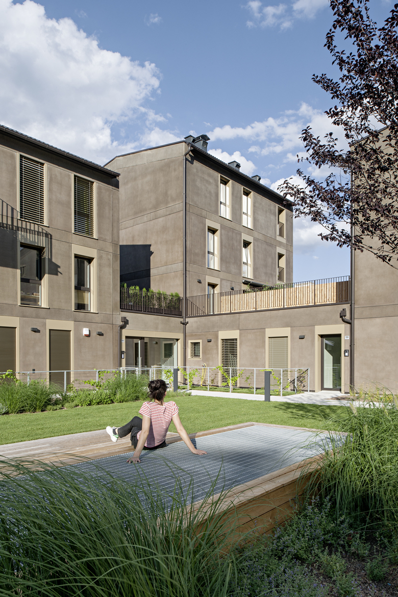 Zentrales Element der Wohnanlage in Eppan stellt ein begrünter Innenhof dar, um den sich die fünf wohl konzipierten Wohnhäuser gruppieren; dieser Freiraum kann gemeinschaftlich genutzt werden und dient somit als Treffpunkt, der das soziale Miteinander zwischen den BewohnerInnen der Anlage fördert.