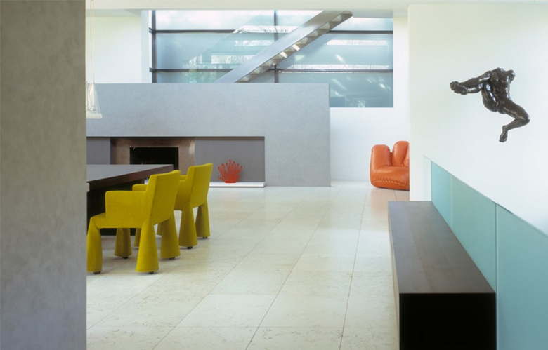 Diese Villa befindet sich in Frankfurt in unmittelbarer Nähe zum Grüneburgpark. Das zweite Geschoss liegt als ein riesiger Block über dem Erdgeschoss. Ein zweigeschossiger Wohnraum entsteht an der Stelle, an der die Blöcke zusammenkommen. Das Erdgeschoss ist als offener Grundriss geplant. Küche, Essbereich und Wohnbereich sind lediglich durch die Möblierung unterteilt. Eine Treppe führt hinter dem Kamin ins Obergeschoss. Hier befinden sich Schlafzimmer, Gästezimmer, Garderobe und das Badezimmer. Unter der Verwendung von authentischen und luxuriösen Materialien wie Makassarfurnier, getöntem Glas, weißem Marmor und Möbel von B&B ITALIA entstand eine puristische und konzeptionelle Villa.