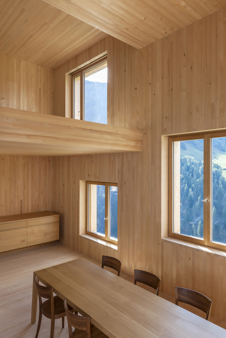 Das Wohn- und Atelierhaus liegt auf rund 1’200 M.ü.M im kleinen Bündner Bergdorf Duvin mit Blick über das Val Lumnezia. Das Dorfbild ist geprägt von traditionellen Holzbauten. Der Neubau integriert sich in diese Umgebung mit seiner klassischen Gebäudeform und der traditionellen Massivholzbauweise, dem Strickbau. Eine Anlehnung bzw. Anknüpfung an die lokale Baukultur findet sich nebst der Gebäudeform und der Bauweise in diversen gestalterischen Elementen, wie zum Beispiel dem mit Blech gedeckte Schrägdach, dem Dachvorsprung oder der Lochfassade, wieder. Entfremdet wird die Fassade durch die Fensterformate und -setzung, die nicht sichtbaren, in der Wandkonstruktion integrierten Fensterläden oder die breiten Fenstergewände. Der Holzbau ruht auf einem zur Hälfte im Erdreich liegenden Betonsockel, welcher sich im Bereich einer dreiseitigen Verglasung in eine Struktur aus gebogenen Betonelementen auflöst. Die Betonstruktur ist statisch relevant und trägt die Strickbau-Fassade sowie das Dach. Die Form der Betonelemente geht einerseits auf Schnitzereien an den lokalen Bauernhäusern und anderseits auf die früheren Fachwerkkonstruktionen zurück.