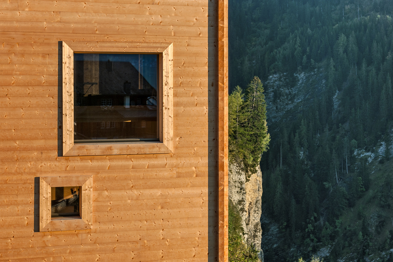 Die Gebäudehülle ist als zweischaliger Massivholzbau erstellt. Die innere Schicht - zusammen mit allen Decken und Innenwänden - wurde aus leimfrei verdübelten Brettstapelelementen (Diagonaldübelholz) mit astarmer Tanne erstellt und mit dem zentralen Betonkern statisch fest verbunden. Die Brettstapelkonstruktion kann als logische Weiterentwicklung des Strickbaus angesehen werden. Es müssen vertikal keine und horizontal nur geringe Schwind- und Quellmasse eingerechnet werden. Im Gegensatz dazu, ist bei der äusseren Hülle in traditioneller Strickbauweise aus Fichtenbalken mit einem starken Setzmass von rund 20cm am höchsten Punkt zu rechnen. Der Strickbau ist daher konstruktiv von der inneren Konstruktion entkoppelt und kann sich frei hinter den breiten Fenstergewänden setzen.