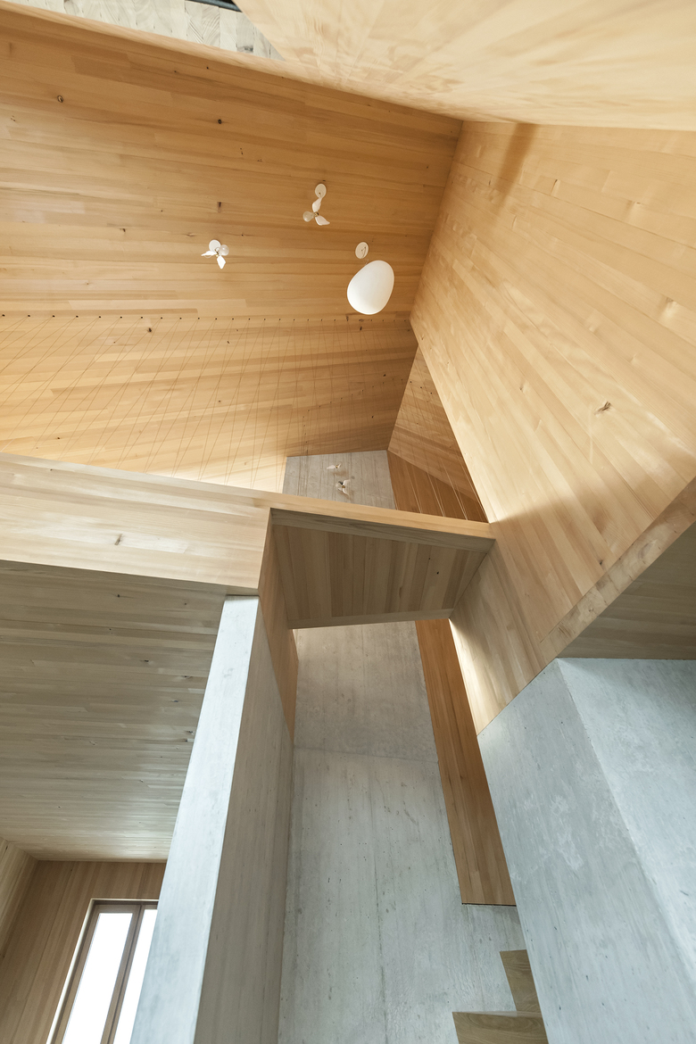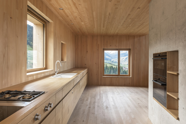 Aussen sowie Innen bringen die konstruktiven Elemente auch die fertige Oberfläche mit sich. Vom Holzbau über den Treppenbau und die Bodenverlegearbeiten bis hin zu den Schreinerarbeiten war eine präzise und saubere Handwerksarbeit gefragt. Alle Elemente wurden fugenlos verarbeitet - es wurde auf Schattenfugen, Deckleisten oder Sockelleisten verzichtet. Die einheitliche Materialisierung von Wänden, Decken und Böden vervollständigt das Bild des „Hauses als Möbel“.