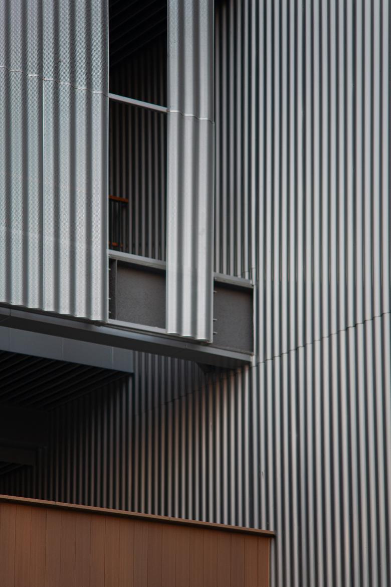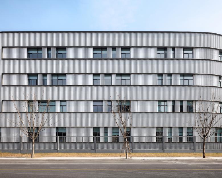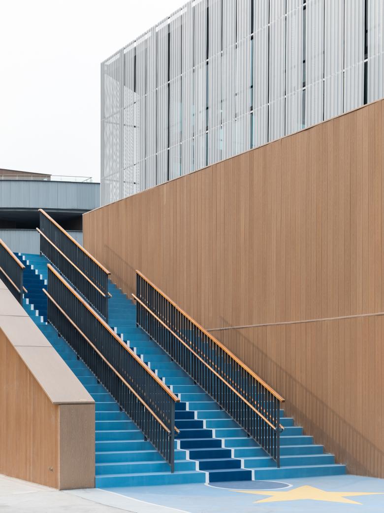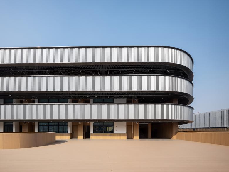 The campus complex is cladded from outside mostly by corrugated metal panels, solid steel ones and perforated aluminum ones. On the inner sides, composite wood panels of a warm tone wrap up the surfaces of more frequent daily use. Such a material selection gives the school an overall shiny and futuristic look while keeps the essential interfaces for the students and teachers soft and approachable.