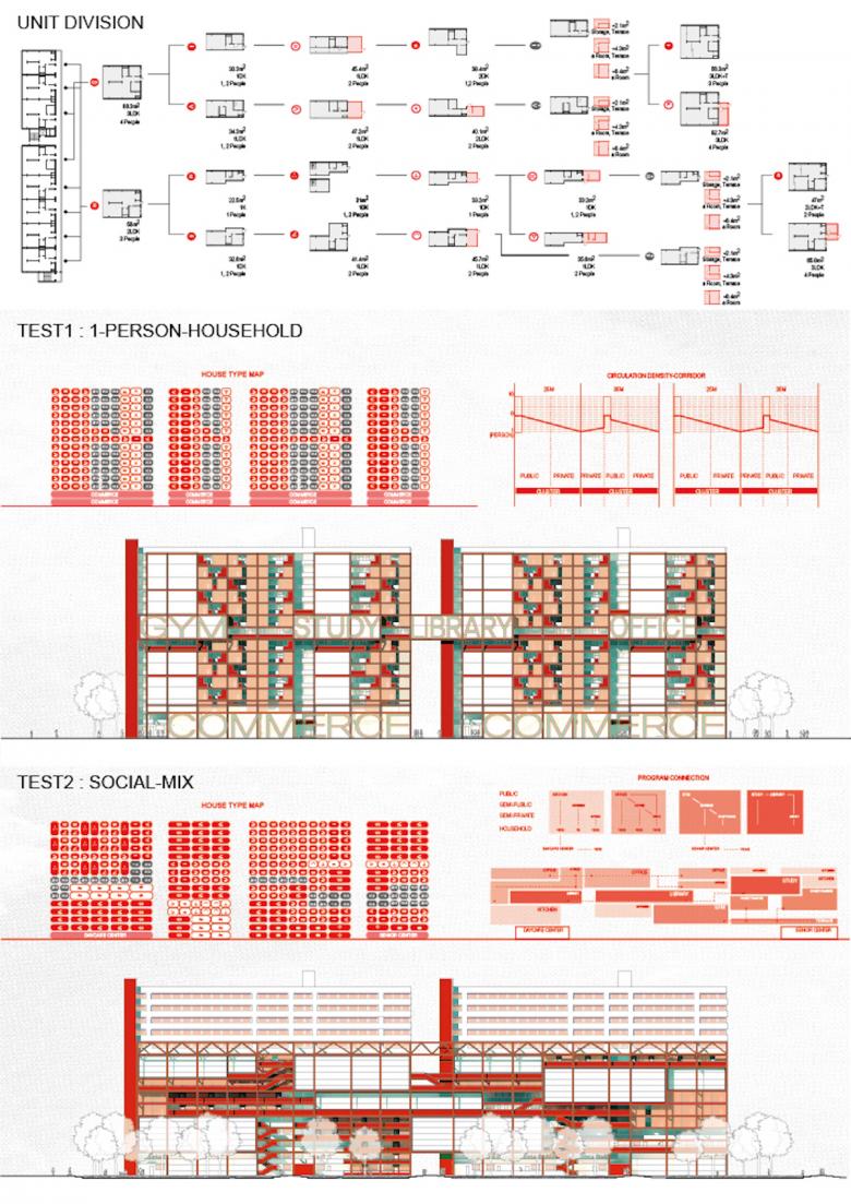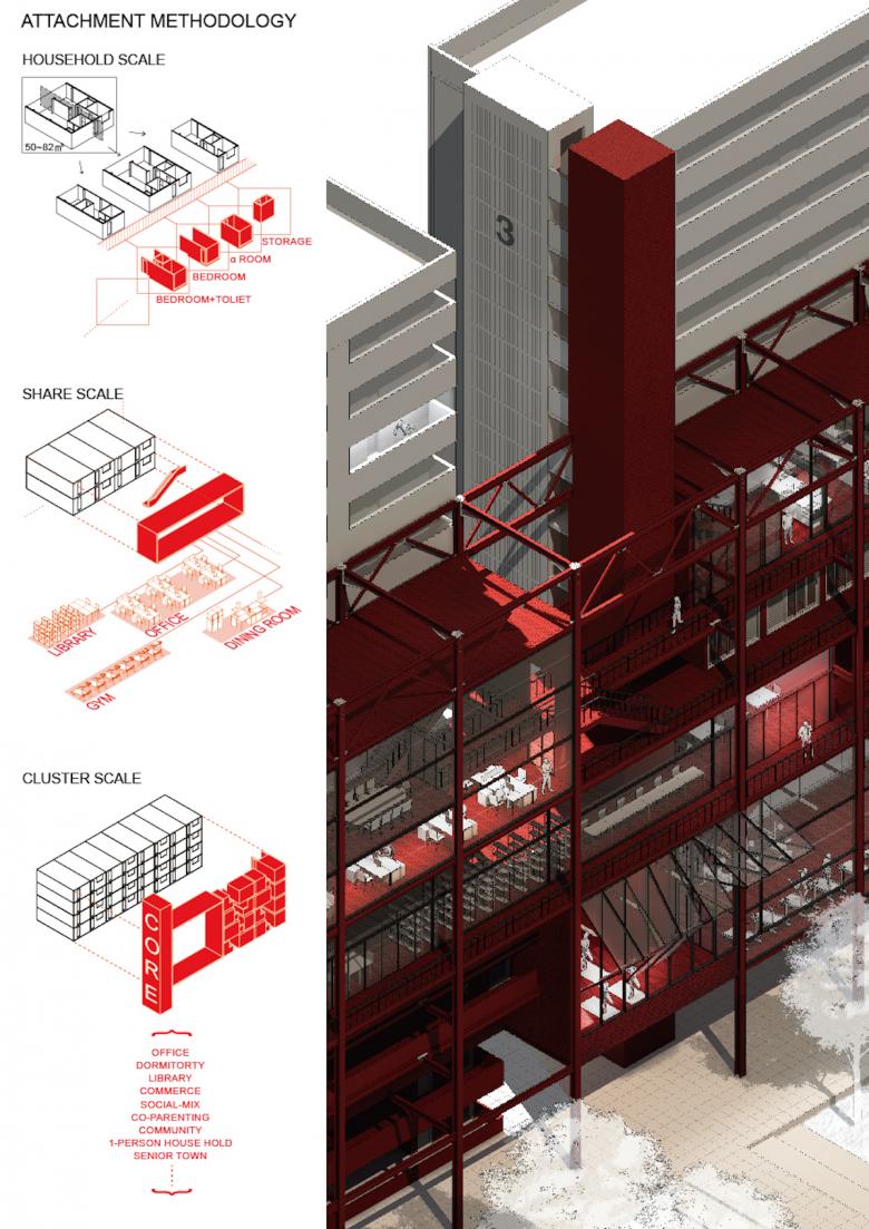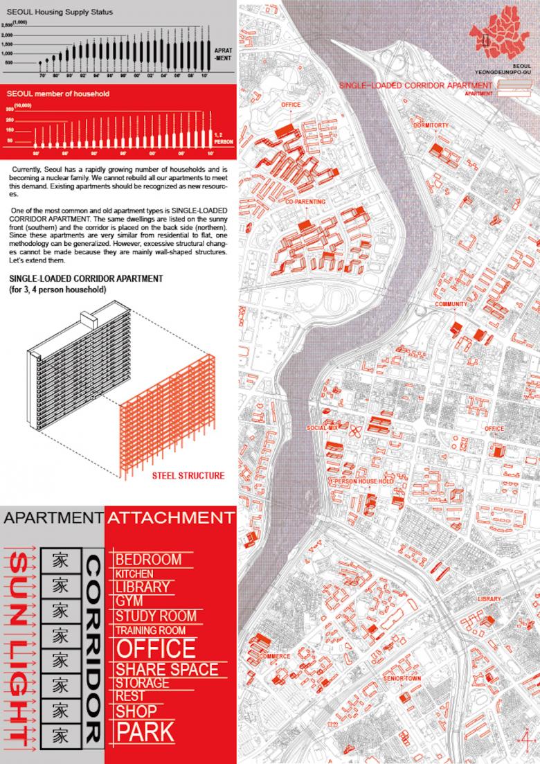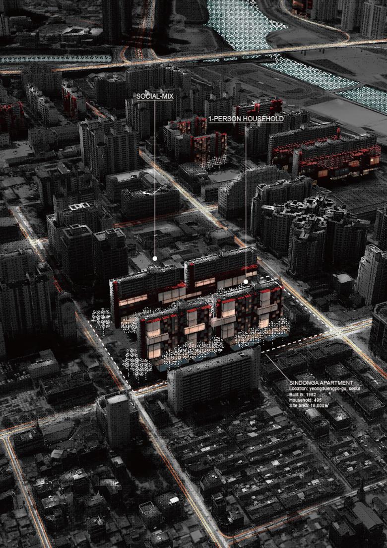 The new demand in Seoul is SPECIALIZED HOUSING. As a member of a household decreases, housing should provide a lifestyle that fits residents within a reduced area. Depending on the person, they may want a large living room, need a personal workspace, or need a children's play space. That means, it should be diversified so that residents can choose. One of the most common and old apartment types is SINGLE-LOADED CORRIDOR APARTMENT. The same dwellings are listed on the sunny front (southern) and the corridor is placed on the back side (northern). Since these apartments are very similar from residential to flat, one methodology can be generalized. However, excessive structural changes cannot be made because they are mainly wall-shaped structures. Let’s extend them. EXTENSION METHODOLOGY. For the sake of the right to sunlight and view, the scope of extension is limited to the back side (the corridor side). 1) Extension of housing unit: Identical housing unit for 3-4 people can be divided into two unit. By extending less daylight affected rooms ( restroom, bedroom, personal work space, etc. ) to the back side of unit, we can reproduce single repetitive unit into variety of new units without compromising daylighting. 2) Extension of shared space: Someone may want to have one large shared space instead of an extension of residence. The shared spaces, which used to be located at Podium in a recent apartment, will be attached in box form to the corridor and have life-tightening programs based on the demand of the neighboring shared generation, such as a shared office, shared kitchen and children's play area. 3) Cluster formation: These formed dwellings and shared spaces are grouped together. As these clusters attach themselves to the back side of single-loaded corridor apartments throughout Seoul, they define new elevation of apartment and respond to the demands needed in the region. The combination is endless, depending on the design intent. The project shows the creation of one giant cluster through the concept of "1-person household" and the combination of various clusters through the concept of "social mix."