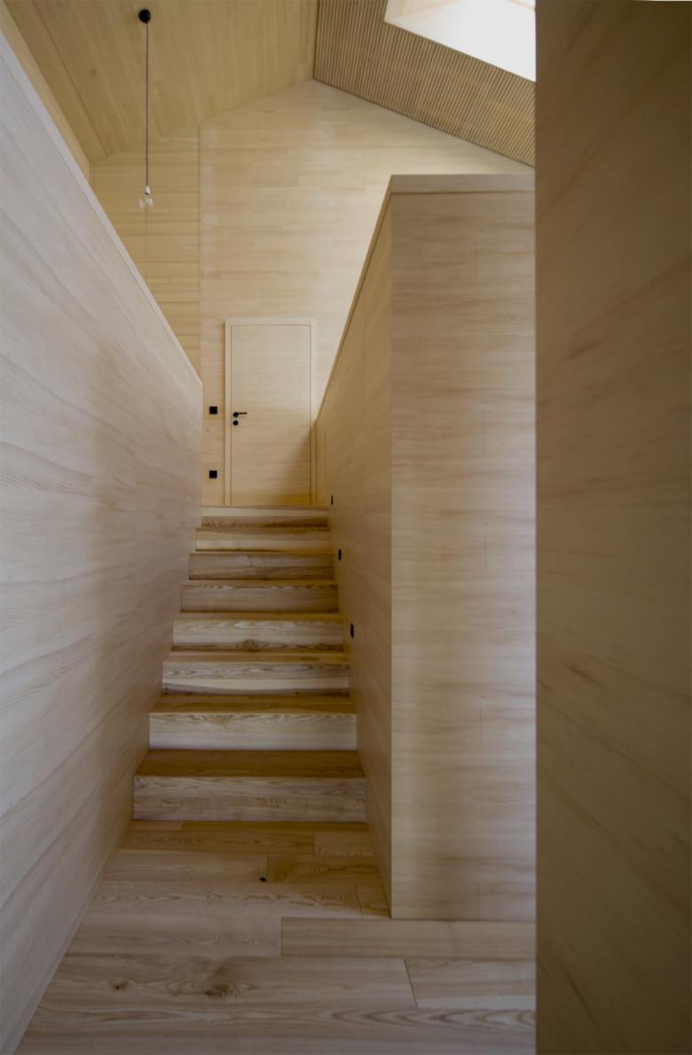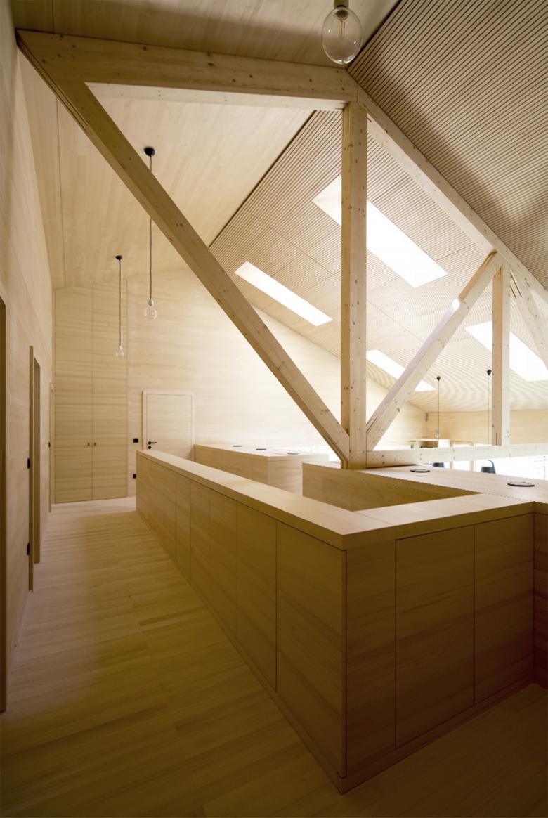 Auf dem massiven Untergeschoss aus Stahlbeton sind 1,5 Massivholzgeschosse aufgesetzt. Die Konstruktion aus Brettsperrholz ist mit Zellulose gedämmt und im Innenbereich mit einer Weißtannendeckschicht versehen. Eine vertikale Lattung aus Weißtanne bildet die Fassade. Das Gebäude wird mit einer Luft-Wärmepumpe beheizt.