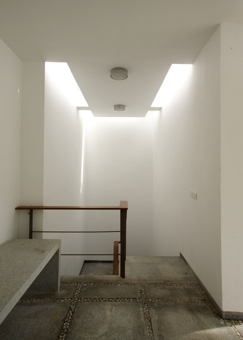 The public and semi public spaces such as the living, dining, kitchen, utility, study and 2 guest rooms are on the ground floor. A staircase clad entirely in teakwood takes the viewer to the private spaces such as the bedrooms and family area on the upper level.