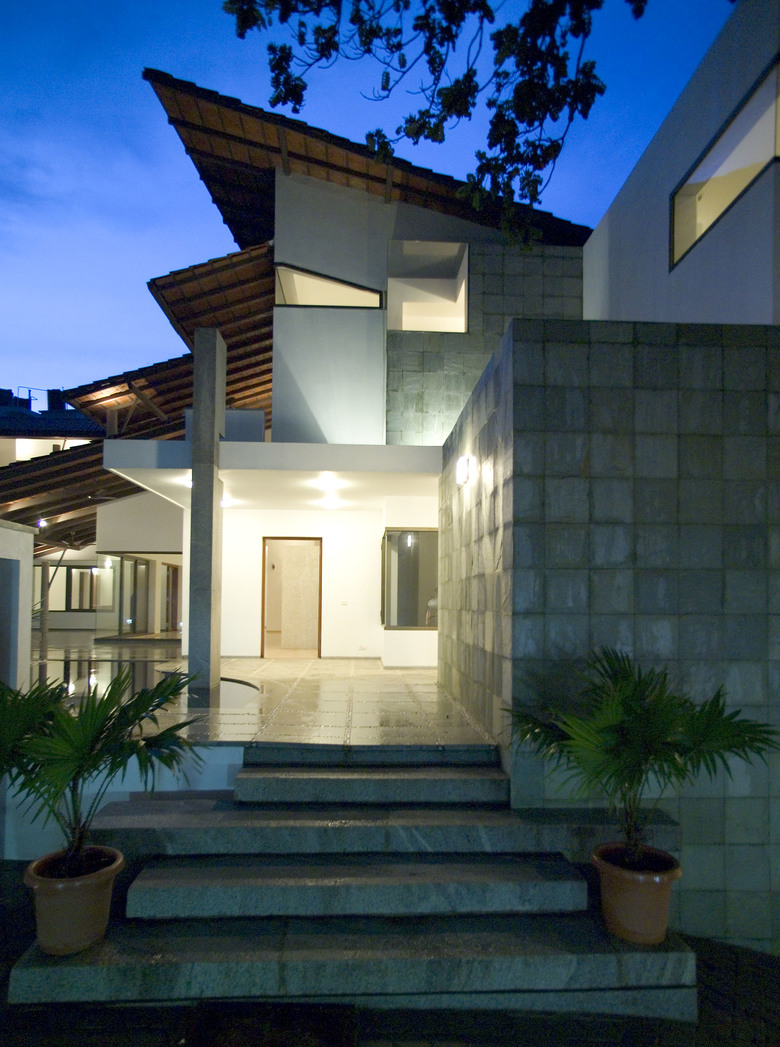 The massing of the house is L shaped and orients itself to a singular lung space in the south. Verandahs on the lower and upper floor covered with sloping Mangalore and Kerala tile roofs overlook this area. The swimming pool is organic in shape and intentionally hugs the lower deck, thus leaving space for an adequate garden.