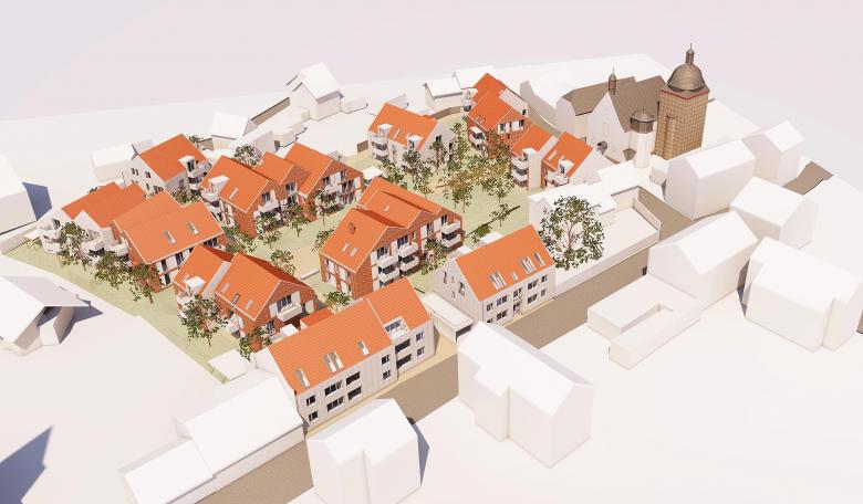 Prägend für das Quartier wird die verbreiterte Sichtachse von der katholischen St. Michaelskirche in der Kirchstraße zur evangelischen Kirche an der Ecke Schubert- Rheinstraße sein. Die Bebauung in der Kirchstraße wird vor der katholischen Kirche etwas zurückspringen, sodass ein kleiner Platz vor dem Gotteshaus entsteht.
