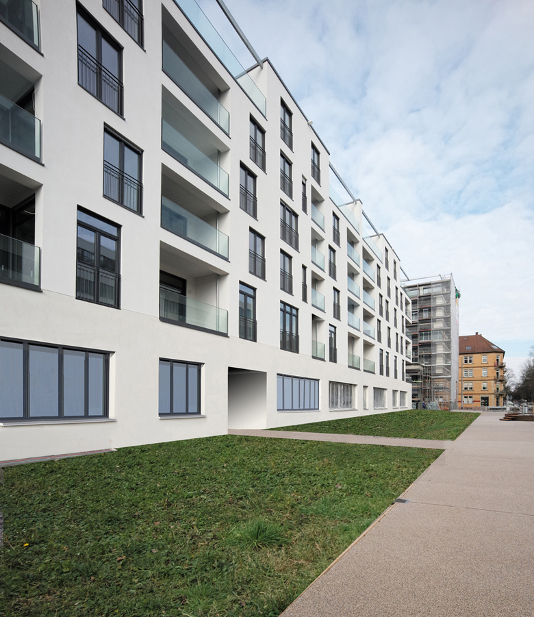 Das vorgegebene Baufeld wurde mit einem städtischen „Block“ besetzt, der die für Karlsruhe typische Blockrandbebauungstypologie aufnimmt und neu interpretiert. Den geforderten Nutzungen werden die Standorte im „Block“ zugewiesen, die die funktionalen Anforderungen optimal erfüllen. Auf sechs Etagen entstanden 66 Eigentumswohnungen, Gewerbeeinheiten und Praxen. Mit der individuellen Ausformung der Fenster- und Loggien- Fassaden wird ein differenziertes Erscheinungsbild, in der Verbindung mit der Materialität eine hohe Individualität erreicht. Die Bürofenster haben eine vertikale Teilung, die Verglasung sitzt im vorderen Bereich des Rahmens, wenn eine Brüstung erforderlich ist, wird diese in derselben Materialität wie die der Lisenen-Rahmen ausgeführt. Die Wohnungsfassaden nutzen dasselbe Thema, hier geht der Rahmen noch in die Tiefe einer Loggia. Transparente Brüstungen unterstreichen hier das Lochfassadenthema.