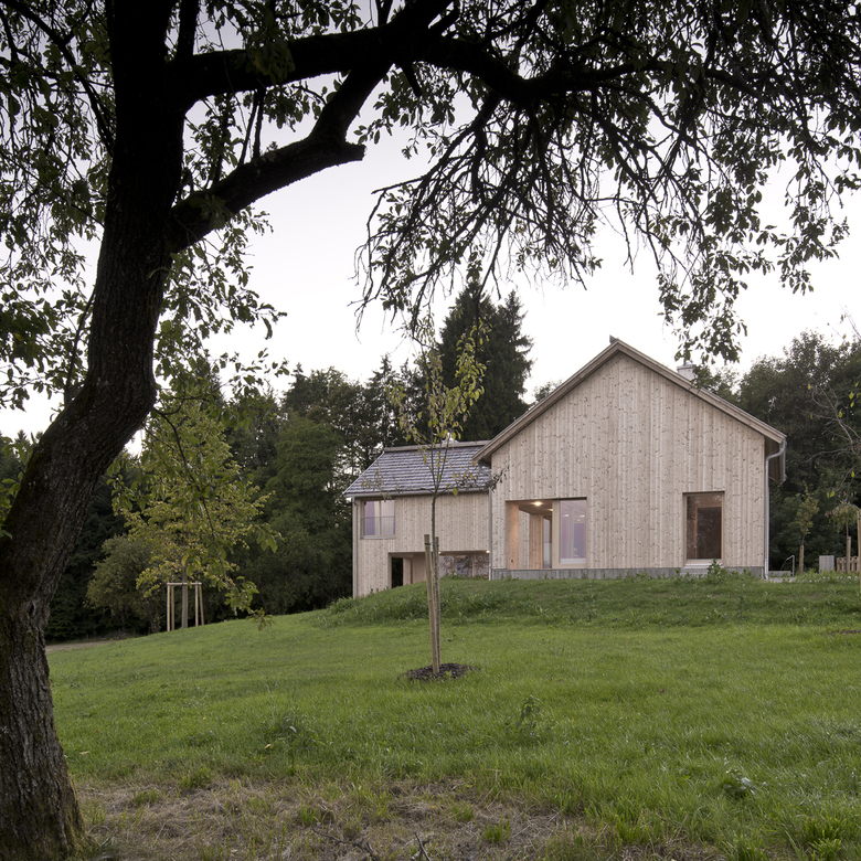Anstelle eines bescheidenen gemauerten Wohnhauses mit benachbartem Stall entstand der kleine, locker gruppierte "Weiler" aus zwei Wohnhäusern und kleinem Gerätehaus. Das ursprüngliche Ensemble am Waldrand strahlte eine gewachsene und entspannte Atmosphäre aus. Vom "genius loci" inspiriert, interpretierte der Architekt die traditionellen Holzbauten im ländlichen Raum neu: So findet sich die optische Durchlässigkeit der Vertikalschalungen landwirtschaftlicher Bauten bei der Gestaltung der Stirnseite mit dahinterliegender Erschließungszone. Text: NM