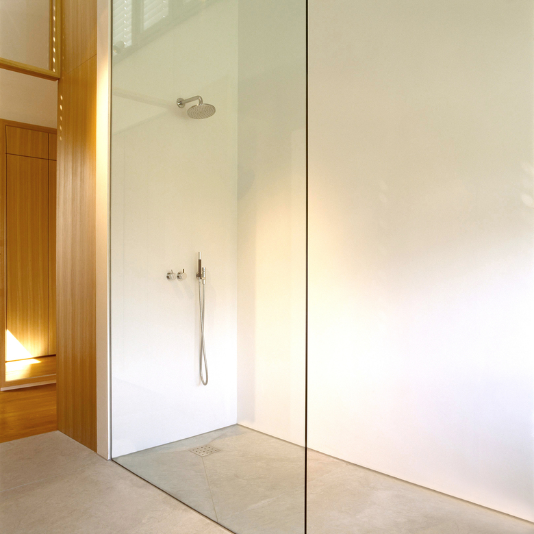 Wenige, handverlesene Materialien wie der hellgraue, spanische Sandstein, Ryster- bzw. Eichenholz und glatte weiße Putzflächen bestimmen die asketische Architektur. Purismus, der sich bis in die Gestaltung des Gartens zieht. Weiße Sichtbetonmauern umfassen und terrassieren schlichte, rechteckige Rasenflächen. Nur am Eingang steht ein alter, windschiefer Birnbaum mitten im Rasen.