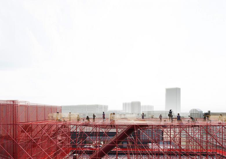 Positioned above the existing buildings, an elastic net structure will provide students with an extraordinary destination. Here, they can reconnect with the iconic skyline of LA, particularly the neighboring Universal Studios campus, all while experiencing a state of levitation.