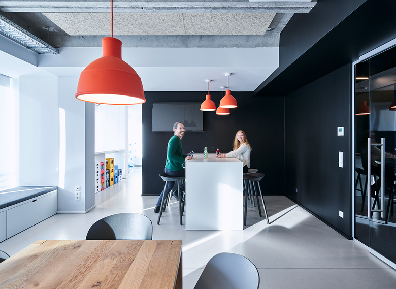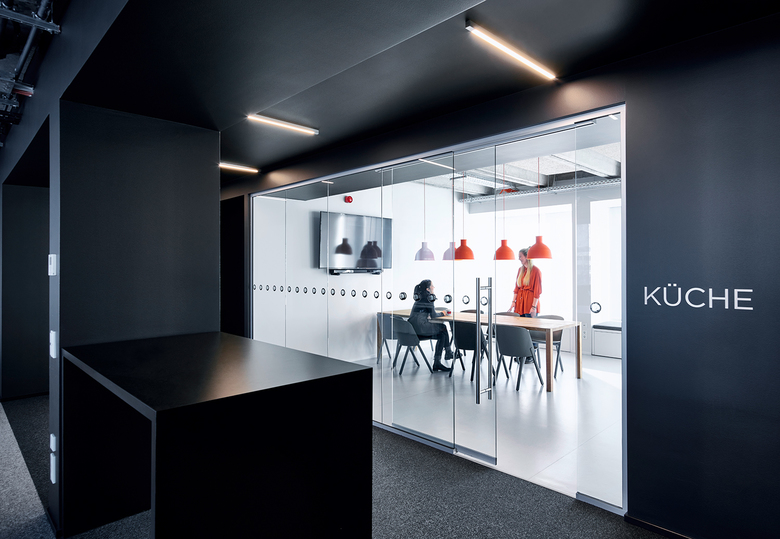 Zu beiden Seiten des dunklen Korridors, hin zu den vom Tageslicht durchfluteten Fassadenseiten eröffnen sich die schlicht gehaltenen Open Spaces. Wesentliche Gestaltungselemente sind hier die frei gelegte Deckenstruktur mit Blick auf die offenen Technikinstallationen, akustisch wirksame Flächen sowie ein lineares Beleuchtungsraster. Die Meetingräume wurden den einzelnen Teambereichen zugeordnet und erhielten eine Glaswandgestaltung mit lebensgroßen Game-Motiven. Als Gemeinschaftsbereich dient die an die Bürofläche angebundene Küche, die gleichzeitig Offenheit und Rückzug bietet.