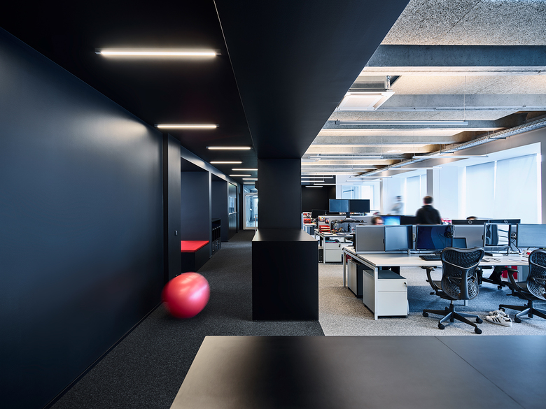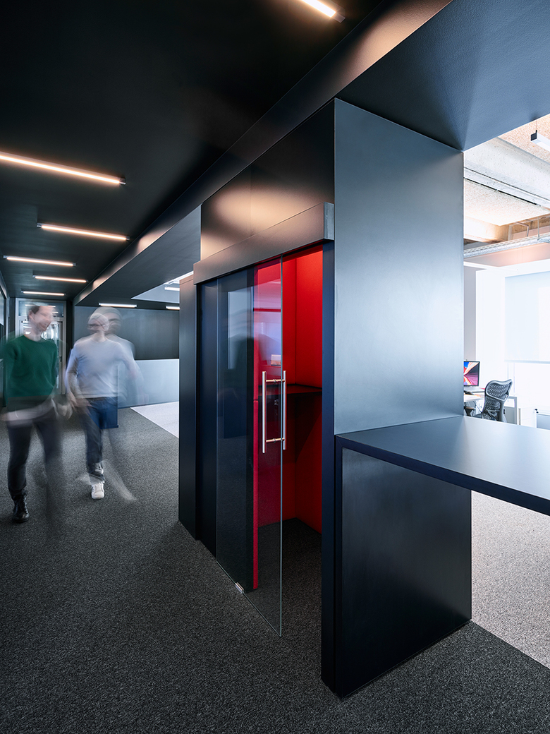 Die neue Bürofläche wird grafisch bestimmt durch einen markanten Hell-Dunkel-Kontrast. Der schwarz gefasste Korridor mit der abgehangenen Decke bildet das Rückgrat, das alle Nutzungseinheiten des Büros miteinander verbindet. Er dient als Laufzone und beherbergt gleichzeitig die Sonderfunktionen, wie die rot gepolsterten phone booths, informelle Meetingbereiche sowie den Servicepoint. Versetzt angeordnete Linienleuchten, die Bezug nehmen auf die Lage der links- und rechtsseitigen Arbeitsplatzbeleuchtung, verstärken die Flucht der Mittelzone.