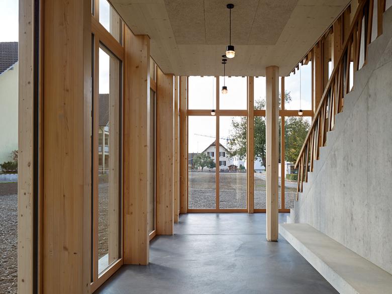 Der grosse Festsaal im 1.Obergeschoss ist das Herzstück des neuen Kulturzentrums von Würenlingen. Hier soll sich das gesellschaftliche, politische und kulturelle Leben der Gemeinde entwickeln. Das Bauernhaus von 1783 mit spätbarockem Erscheinungsbild ist ein wertvoller Zeuge der ländlichen Baukultur. Mit grosser Sorgfalt wurden die bestehenden Bruchsteinmauer erhalten und reaktiviert. Im Saalinneren wird die Dimension des mächtigen Bauernhauses spürbar, bestehende Lüftungsschlitze erinnern an die ursprüngliche Nutzung. Der Saal ist ein atmosphärisch dichter Raum; die leichte Wölbung der mit Stoff überspannten hölzernen Decke steht im Kontrast zu der Strenge der Geometrie der neuen Dachkonstruktion. Eine Dämmung aus Schafswolle absorbiert die Stimmen und Geräusche der Besucher und sorgt für ein natürliches Raumklima. Die Wände aus Kalkputz, sowie der Riemenboden aus massiver Eiche tragen zur behaglich warmen Ausstrahlung des Saales und einer einzigartigen Atmosphäre bei.