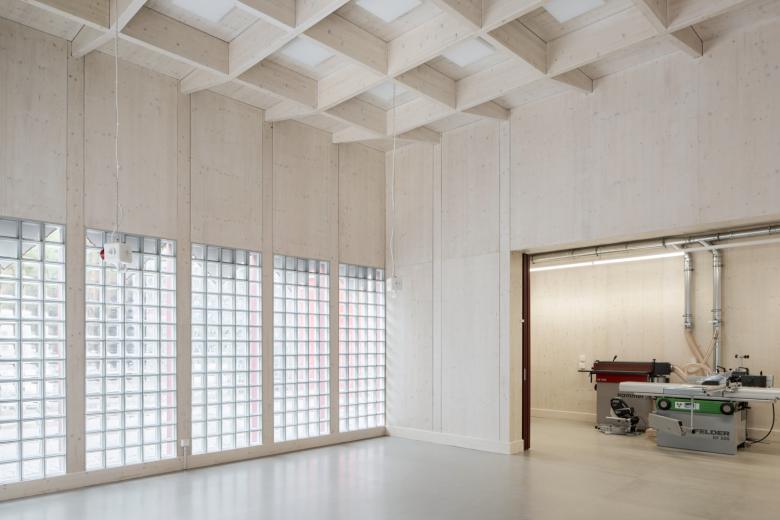 Der zentrale Werkraum setzt sich durch seine Höhe und das äußere Erscheinungsbild von der umschließenden Nebenfläche ab. Neben der Konstruktion wurden auch innere und äußere Wandbekleidungen in Holz ausgeführt. Die im Inneren auf die Konstruktion reduzierte Erscheinung kontrastiert mit der differenzierten und kleinteiligen äußeren Fassadengestaltung. Im oberen Fassadenbereich sind die Ausfachungen mit ornamentalen Holztafeln versehen, welche wie ein Vorhang über der transluzenten Verglasung hängen, die schemenhafte Einsicht in die Werkstatt gewährt.