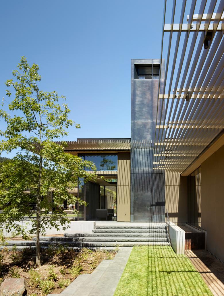 Spaces between the home’s various structures engage the landscape, which is organized into two interconnected parts. The cultivated portion of the site, with vineyards and olive tree groves, contains the “public” areas of the house, including living, dining and entertainment areas. The other side of the site, delineated by an infinity pool and gentle slope, opens into uncultivated meadow space. An earthy exterior palette inspired by the California woodland setting continues inside the home, which features a collection of custom furniture and lighting designed by Jim Olson. The result is a home integrated with nature, not only philosophically and visually, but from a practical perspective as well.