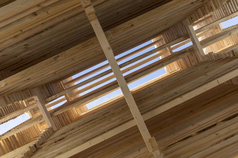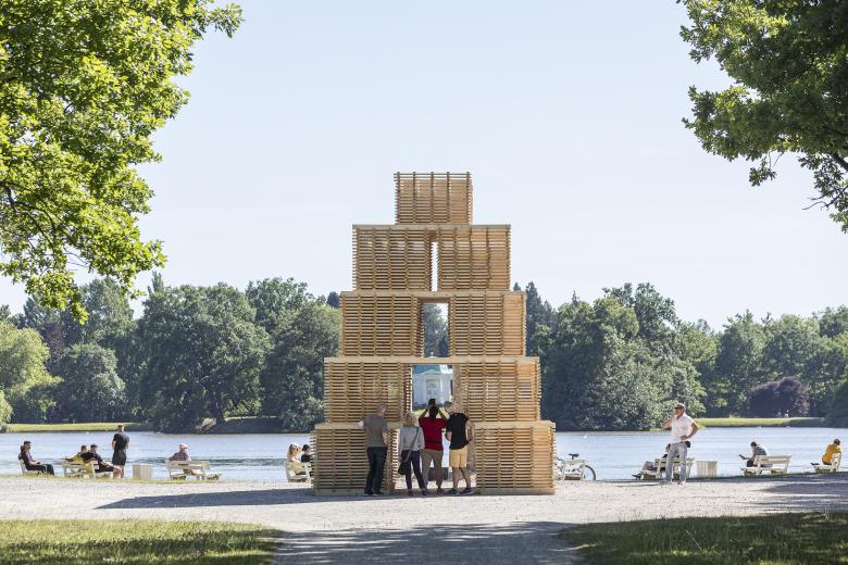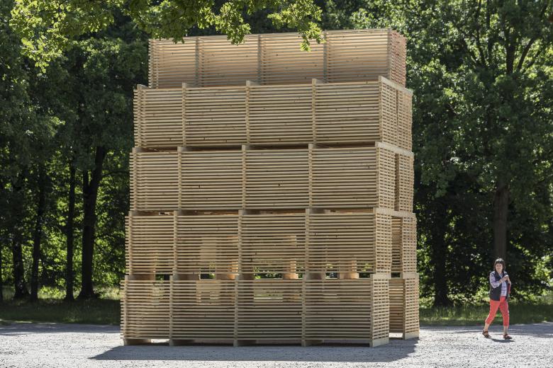 The Reflecting Point Collective consists of horizontally stacked wooden fences that form an open interior space with seating niches. In woodland settings, these fences serve to protect young, biodiverse trees. When fully erected vertically, the 850-meter-long fence structure can safeguard up to 5,000 young trees from browsing damage during their early growth. After seven to eight years, as the tree tips grow beyond the reach of wildlife, the fences complete their purpose and naturally decompose into humus, enriching the surrounding soil.