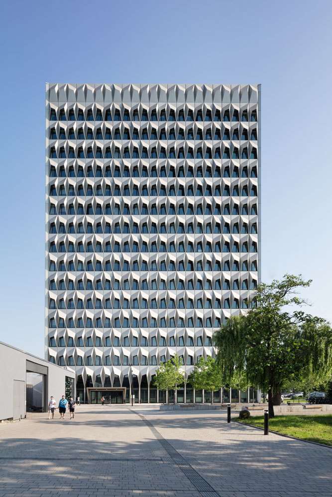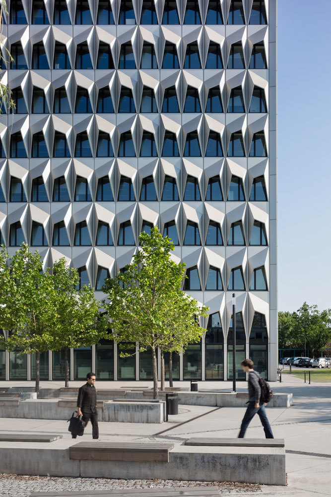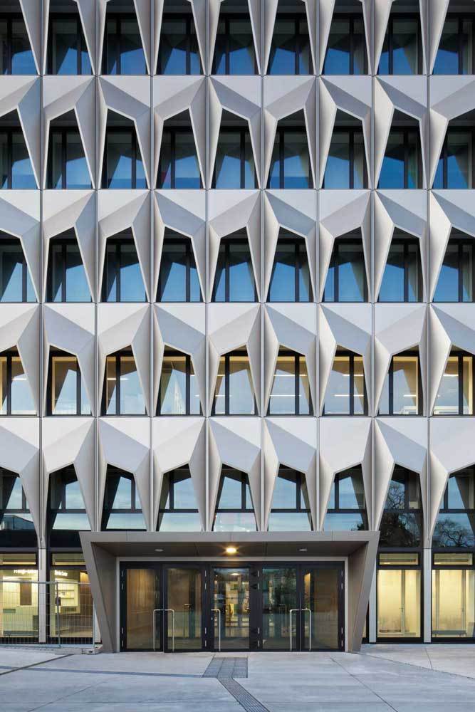 Die Fassaden entwickeln Ihre Eigenheit aus der Ausrichtung nach den Himmelsrichtungen und aus der Lage auf dem Campus bzw. in der Stadt. So erhält die Südfassade über die gesamte Front dreidimensional gefaltete, auf die vorhandenen Fensteröffnungen bezogene Sonnenschutzelemente aus Leichtmetall, mit denen ein Optimum zwischen Tagesbelichtung und Sonnenschutz erreicht wird.