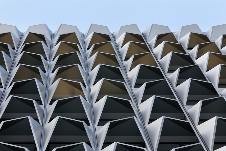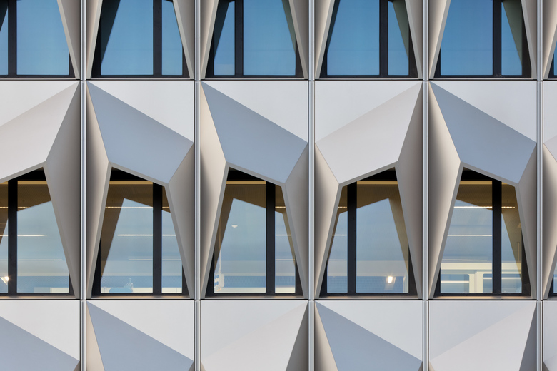 Die geometrische Ausgestaltung der feststehenden, wartungsarmen Sonnenschutzelemente wurde aus den Vorgaben einer Simulationsberechnung zum Sonnenverlauf in Zusammenarbeit mit dem Büro Transsolar entwickelt.