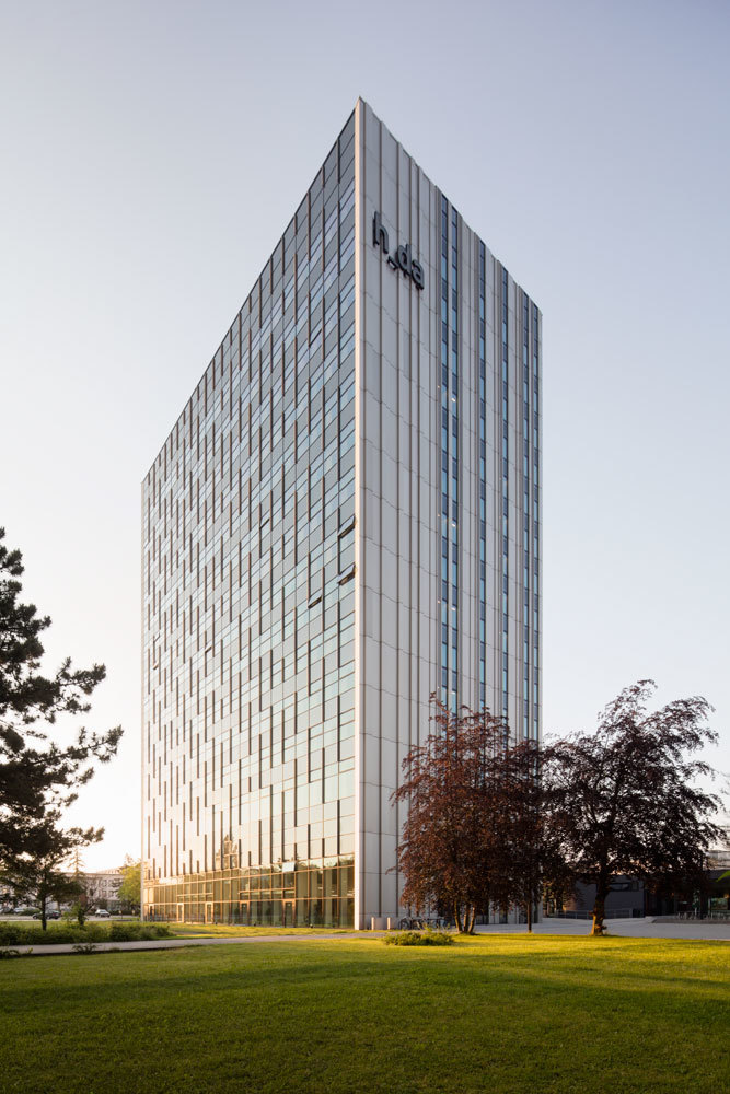 Die nördliche, der Innenstadt zugewandte Längsseite erhält eine elegante großflächige Glasfassade mit vertikalen Lisenen. Die Ost- und die Westfassade werden als senkrechtes Relief aus Leichtmetall ausgebildet, um die Vertikale der Schmalseiten zu betonen und damit optische Wirkung der Proportionen zu verstärken.