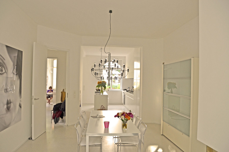 Nach Ertüchtigung der Holzbalkendecke wurde eine Fußbodenheizung installiert, Terrazzo und Epoxydharz wurden als Belag für die Räume verwendet. Die 2,70 m hohen Innentüren wurden mit eigens entwickelten Blockzargen und verdeckten Bändern eingebaut. Zeitgemäße Bänder und eine energieeffiziente Haustechnik mit Bauteilaktivierung wur- den installiert. Um den Raumbedarf zu erfüllen wurde der Bestand im Westen durch einen Anbau erweitert.