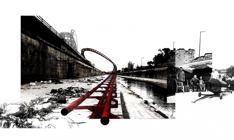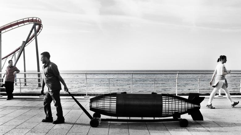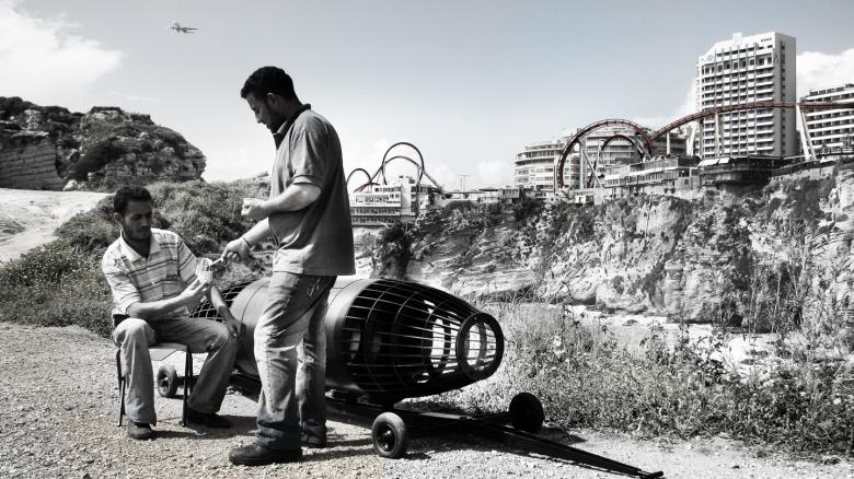 Concept: Bernard Khoury in collaboration with Yasmine Almachnouk Production: Georges Daou, Ryan Mehanna & A.C.I.D. As an ultimate act of resistance to a falsified history in which we have become passive actors, are we capable of inventing the tools that can overturn Beirut’s sensational stereotypes and denounce the innumerable fantasies attributed to it. We propose to draw an infernal circuit in which the sensation-driven tourists seeking instant gratification are propelled in a pre-determined course. As passive projectiles, the tourists are placed in a hermetically lethargic situation to ultimately be embedded in expected representations and clichés of our city. Beirut becomes an exotic amusement park destined to be consumed through representations of a History that escapes us, postcards that will hopefully be deemed historical waste. Saïd, bearer of the rolling capsule, wanders the city awaiting the occasional tourist. His task consists of recuperating the device at the bottom of its course and hauling it back to its departure point. Before being assigned this duty, Saïd was a porter at Beirut International Airport. French Photographer Eric Lambert came to Beirut to document the circuit that was jointly implemented by private investors and the Lebanese Ministry of Tourism. Soon enough, Lambert’s fascination for Saïd’s routine prevailed over the initial object of his research: the tentacular tracks within the cityscape become a mere background to the city that has yet again assimilated another layer into its fabric.