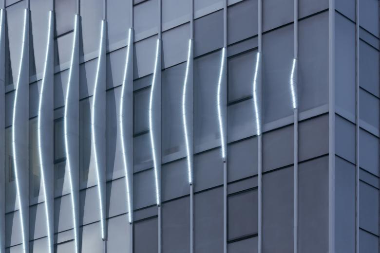 With the coming of night, the rhythmic curtain wall changes from dynamic to static. The LED light clearly outlines the white curved aluminum plate, and stays on the building as soft as a sculpture in the night.