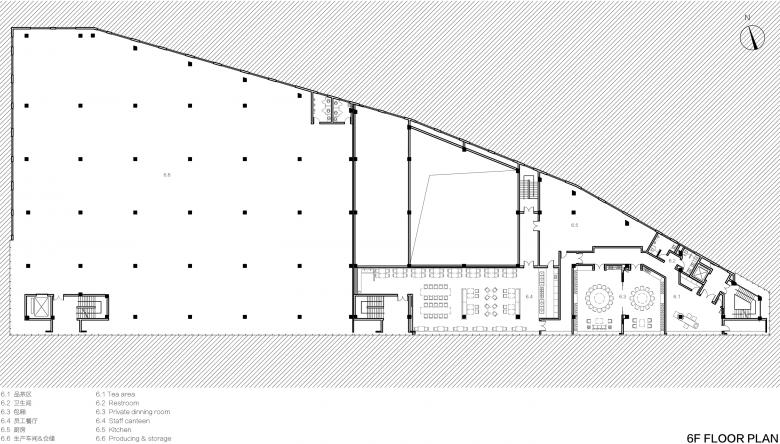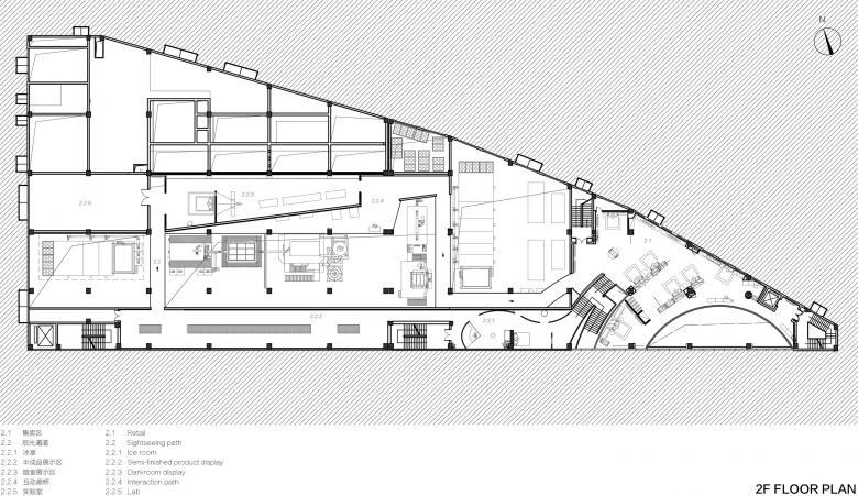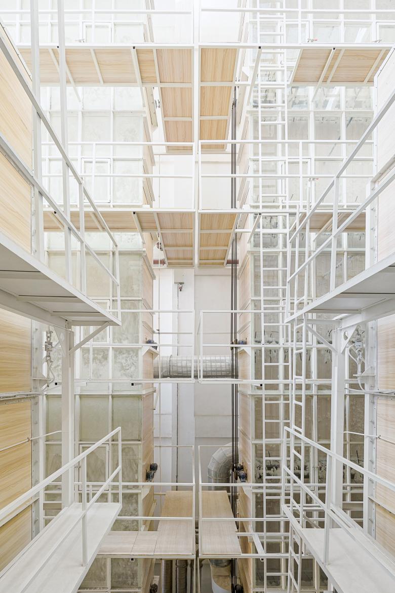 In the southwest factory area where the architect applied foggy glass, which visually avoids the chaos inside. At the same time, foggy glass makes the indoor and outdoor vision become hazy, which makes people curious. Inside of the factory area, the central block is removed, so that the producing machines around the atrium, creating a factory under the sky light for workers.