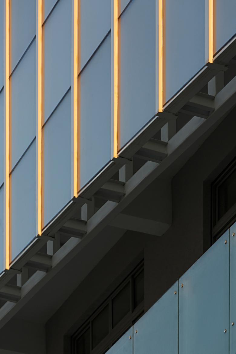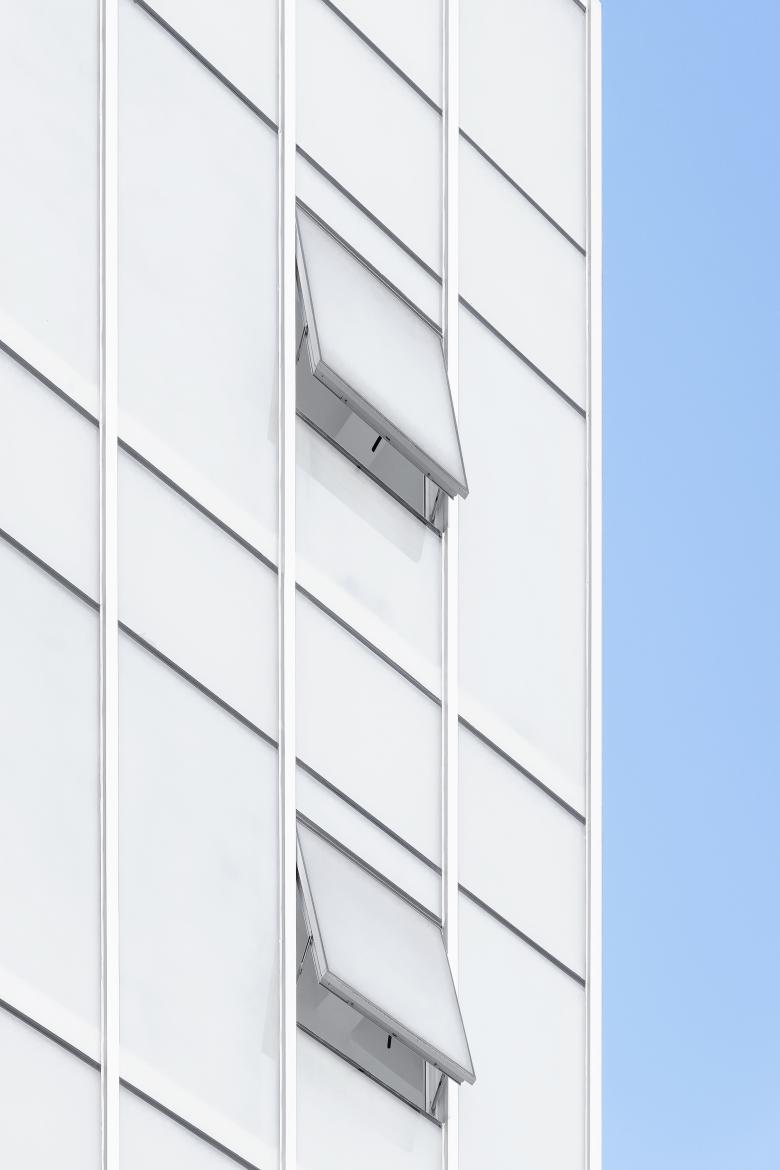 The architect designed the external corridor connecting factory and office area on the third floor. The corridor is suspended on the facade in the form of semi outdoor, which provides more convenient traffic flow for two main areas, and creates a co-work space for people to communicate. Meanwhile, the external corridor brings balance between two different materials: white glass curtain wall and concrete. The supporting structure of curved aluminum plate is clearly with the rise and fall rhythm in the corridor.
