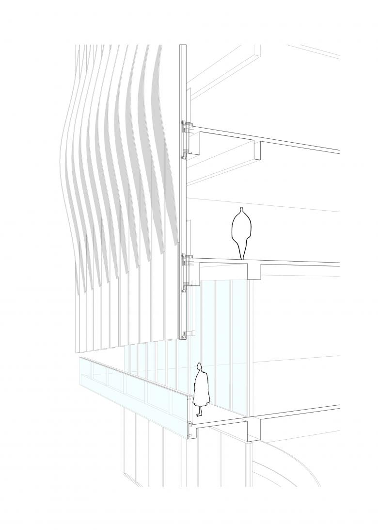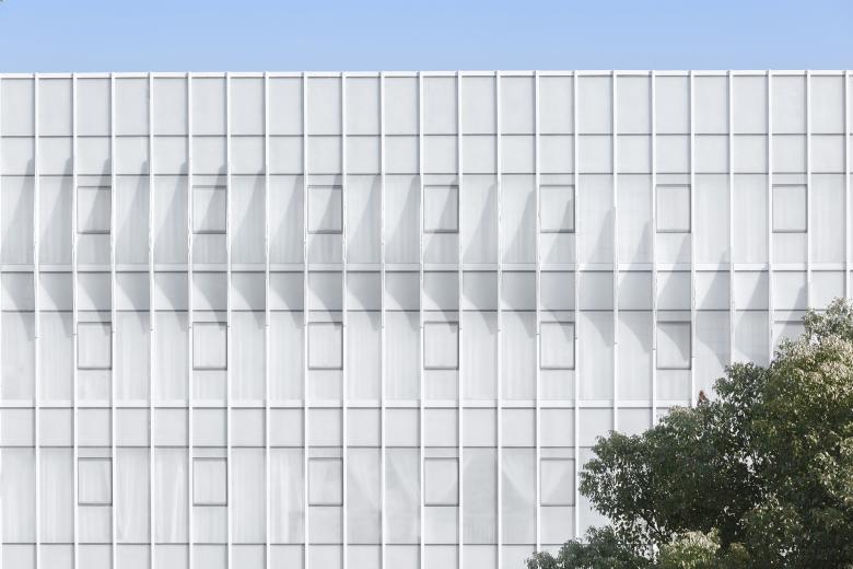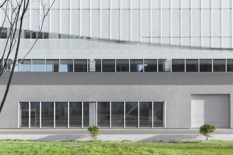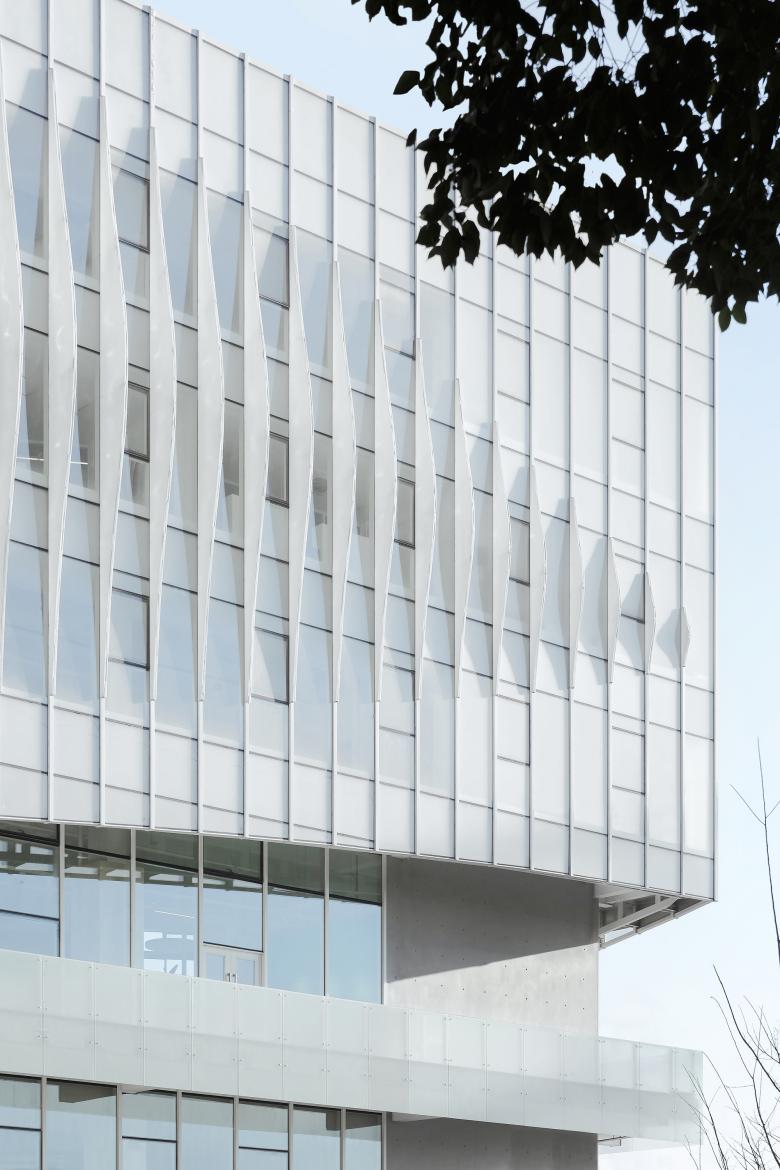 The building is designed as two parts: suspended and solid. Low area as solid concrete, forming a thick and stable building base, and the high area is curtain wall system with gradient translucent glass and white curved aluminum plate. The concrete wall is designed to be retreated, which makes the white curtain wall more transparent and suspended in the air.