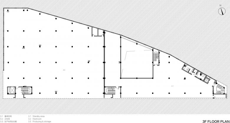 Two-way access is divided by main functions: factory and office. The entrance of the factory area is located in the west of the building, and it is connected with the main entrance by the shortest distance to produce an efficient working access. The outdoor space retreated inside 30 meters is far away from the noise of the main road, and it makes office environment become more independent and quite. Furthermore, the green land guides the people to the southeast of the building where is office & retail space located.