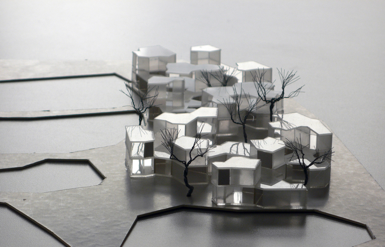 The hotel is located in Art Village, 3rd phase of Xixi wetland in Hangzhou. The site was a new rural settlement. Ponds and ditches are scattered around the houses, with big persimmon trees standing nearby. The settlement is a product of nature, whose characters resembles natural phenomenon, such as “extension and border”, “similarity and difference”, “aggregation and production”. The design adopts an organizational structure in terms of “one point and three lines”, which corresponds to the foregoing features, like a cluster of cells, a group of bubbles, a branch, a leaf, or even a film of cobwebs. It expresses some order of nature, brings nature’s uncertainty, and intends to create an pure and clear original style.