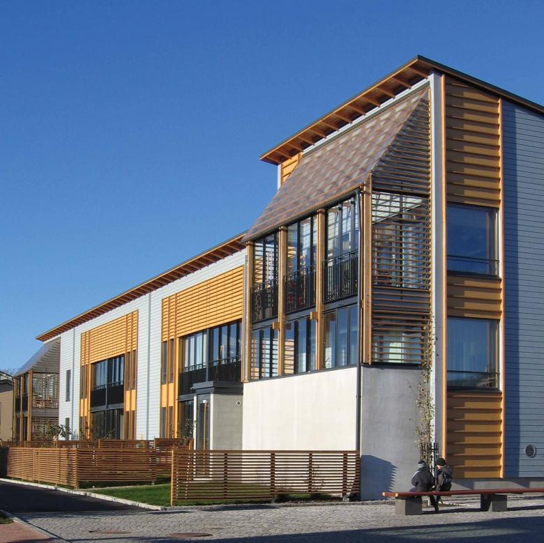 Passive methods for conserving energy are applied to the orientation of the houses, the facade openings, and the sheltered glazed balconies, which give access to the low-lying sun during the colder seasons. Some of the buildings are also equipped with solar panels. Due to strict financial limitations, all proposed technical innovations and solutions were not fully realised. The architecture can, however, be easily adjusted to the ecological choices of the inhabitants.