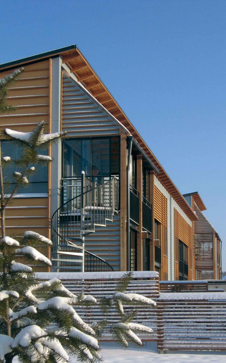 Social aspects were a big consideration, both in the private homes and among neighbours. The floorplans are designed so as to be spacious enough and adaptable enough for future living needs with only furniture changes, instead of requiring renovation or demolition. The rooms have flexible layouts with raised access floors and there is a variety of solutions for common spaces in the block. The residents were given the choice of private saunas but most preferred the communal facilities. The perimeters of the yards are defined by outbuildings comprising communal utility facilities and saunas that can be heated with electricity or wood. The timber design of the low-rise units is in warm-coloured shades. The buildings create a backdrop for the allotment gardens and greenery.