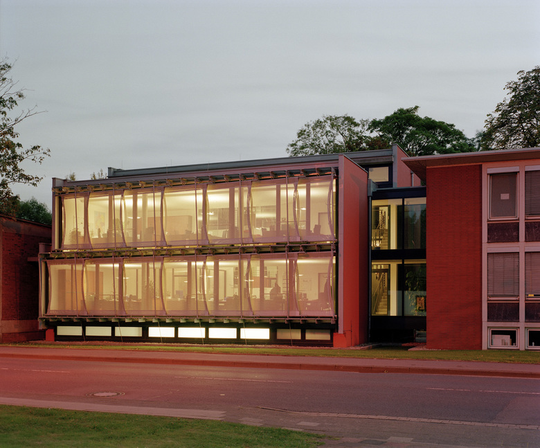 Die Anordnung der Stockwerke in Halbebenen erleichtert die Kommunikation unter den verschiedenen Teams. Das zweiseitig grosszügig verglaste Gebäude ist mit einem Sonnenschutz-System aus gespanntem Stoff ausgerüstet. Der Energieverbrauch ist optimiert namentlich durch eine gut isolierte Gebäudehülle und durch den lichtdurchlässigen Stoff, der die direkte Sonneneinstrahlung im Sommer absorbiert.
