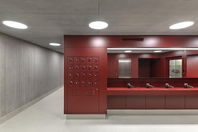 Die Inneraumgestaltung der Schwimmhalle spielt mit den Parametern "hart" und "weich"; im Nassbereich bilden die Sichtbetonwände zusammen mit den hellen Mosaikböden ein robustes, beständiges und rutschfestes Untergeschoss. Das OG ohne Spritzwasserkontakt wurde als weiches Gegenstück in Fichte Vollholz ausgeführt. Grosse Fensterflächen versorgen die Schwimmhalle mit Tageslicht. Im Wellnessbereich sind die Material-Gegensätzen noch grösser; die fensterlose Zone mit Saunen, Wärmestein, Kneippstationen und Duschen ist dunkel gefliest, wogegen der taghelle Ruheraum in Vollholz in starkem Kontrast steht.