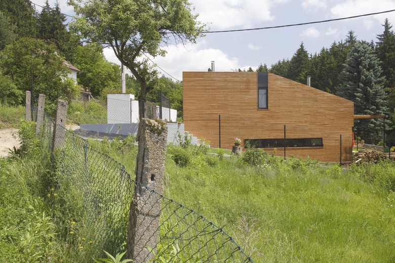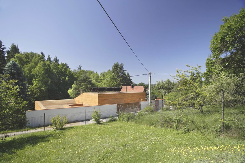 The main theme is as best coalescence of the house with the surroundings as possible, preservation of the character of the local development while maintaining an incomparably larger construction program – a contemporary family house providing a standard BOH compared with the local cabins undoubtedly does meet this requirement. The land slopes downwards from the access road. As it faces south, it was possible to hide a part of the house below the ground and thus control its volumetric effect within the above-mentioned context. Also the fact that the free façade areas are limited positively affects the energy consumption.