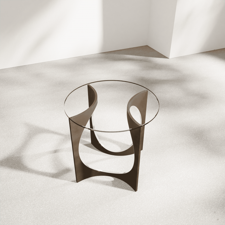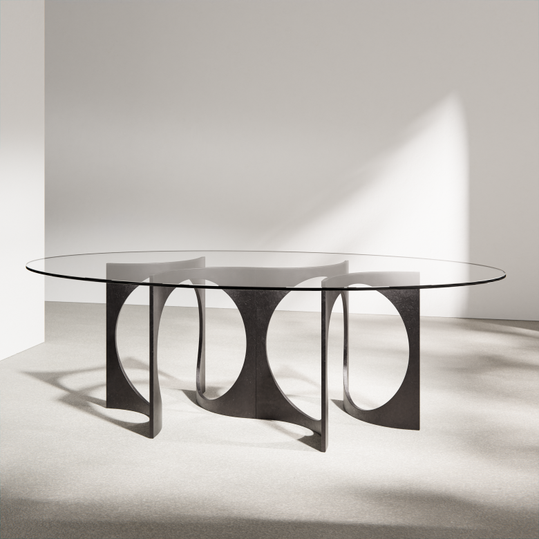 The base is handcrafted in Belgium from four identical cast elements in bronze or cast iron, that are artistically welded into a continuous, organically shaped sculpture.