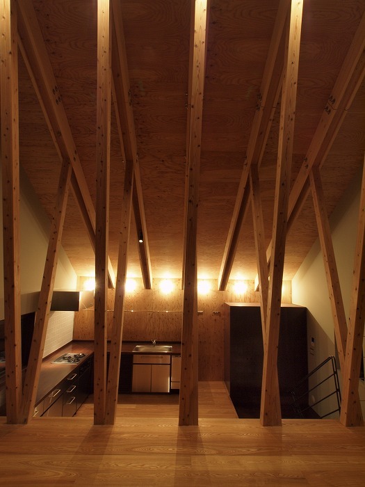 This project chooses the latter interpretation, and intentionally plays them up. The frame is composed of V-shaped posts supporting beams constructed from commonly available timber elements. These are lined up to create a space that is fairly large for a wood-framed structure. The post-and-beam sets themselves serve to define the boundaries of the space.