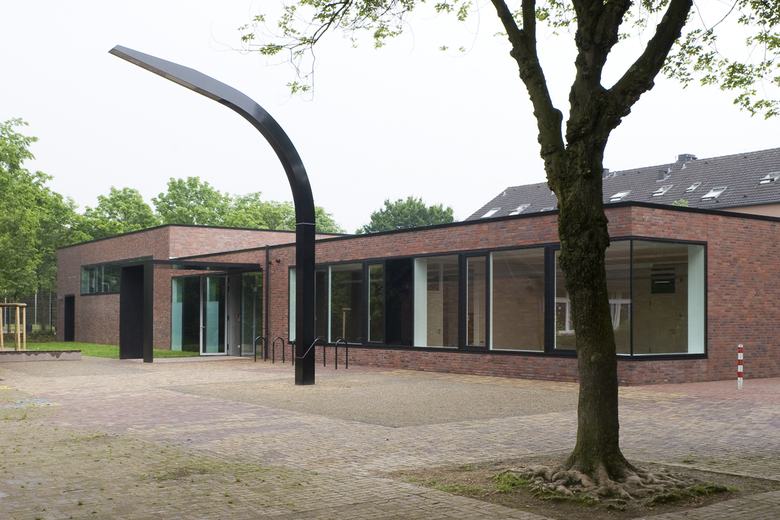 Organisation braucht Farbe. Außen erweitert Innen – Eine Gymnastikhalle bietet Platz für sportliche Aktivitäten. Normalerweise. Denkt man in Raum-, Farb- und Detailkonzepten, wird aus einem Kubus ein erfrischendes Erlebnisangebot. Drinnen organisieren orange und grün die Bereiche Service und Nutzung. Draußen inszeniert die Landschaftsplanung Design, Funktion und Natur. Insgesamt entsteht ein Baukörper, der auf Schulsport, Räume für die Ganztagesschule sowie auf Abendveranstaltungen eingerichtet ist.