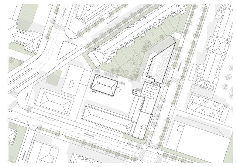 Somit bleibt nicht nur die Bausubstanz sondern vor allem auch die Bedeutung des Gebäudes für den Ort erhalten. Gleichzeitig wird im Anschluss an die Kaserne der Platz frei für einen, auf die Bedürfnisse der Genossenschafter*innen perfekt abgestimmten Neubau. Seine Struktur bietet die nötige Flexibilität, um darin die mannigfaltigen Wohnungsgrundrisse sowie eine Tagesschule im EG zu beherbergen, aber auch auf ändernde Bedürfnisse der Bewohner*innen reagieren zu können.