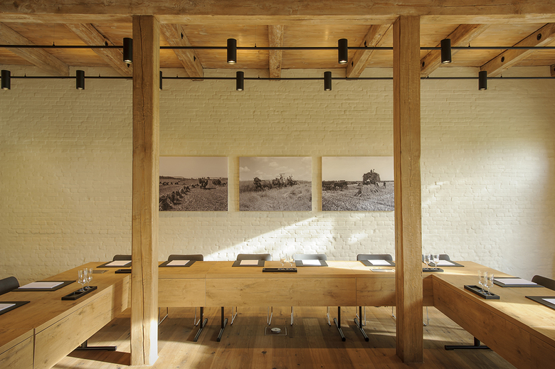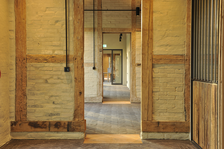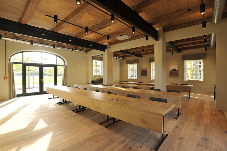 Die eigens gestalteten Leuchten heben die sanierten Holzbalkendecken und Mauerwerkswände hervor und lassen diese als Gestaltungselemente atmosphärisch wirksam werden. Entree und Erschließungsbereiche wurden in dunklem Klinker gepflastert, die Durchgänge mit breiten Holzschwellen im Boden abgesetzt. Die Tagungsräume erhielten einen „Teppich“ aus Eichenholzdielen, der sich mit einem Randfries aus Estrichbeton gegen die historischen Bestandswände abgrenzt.