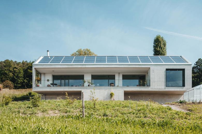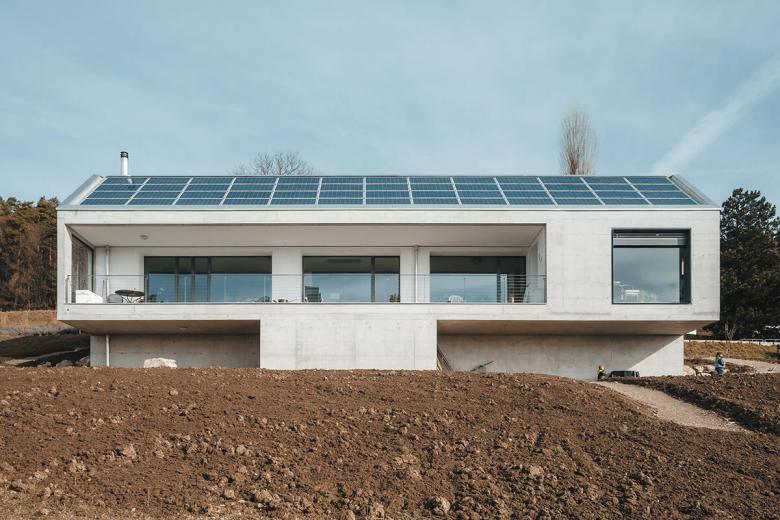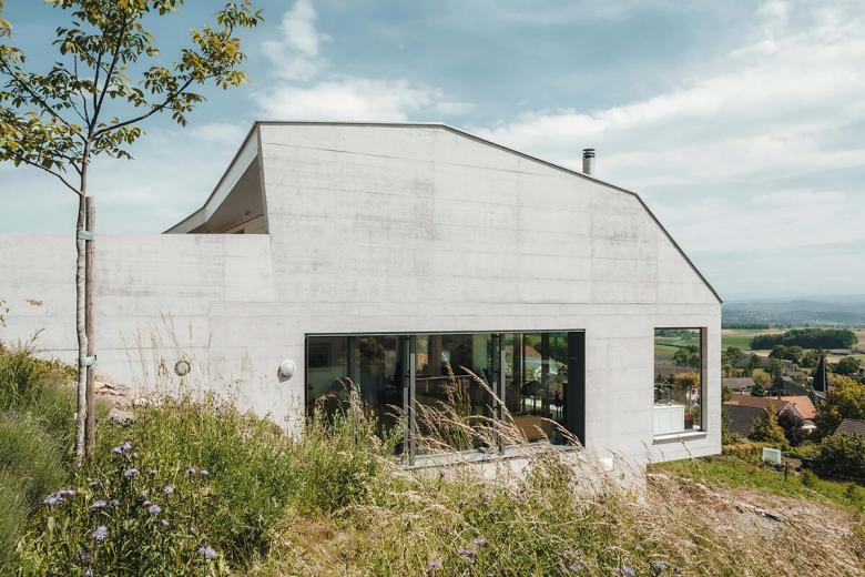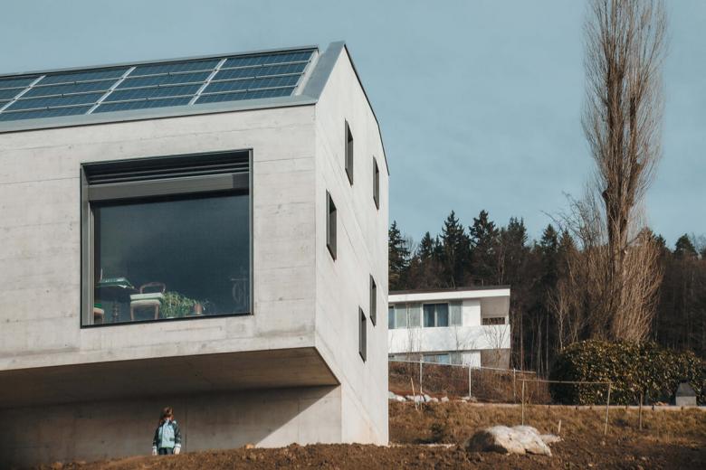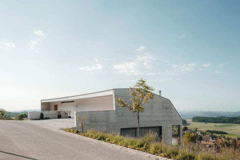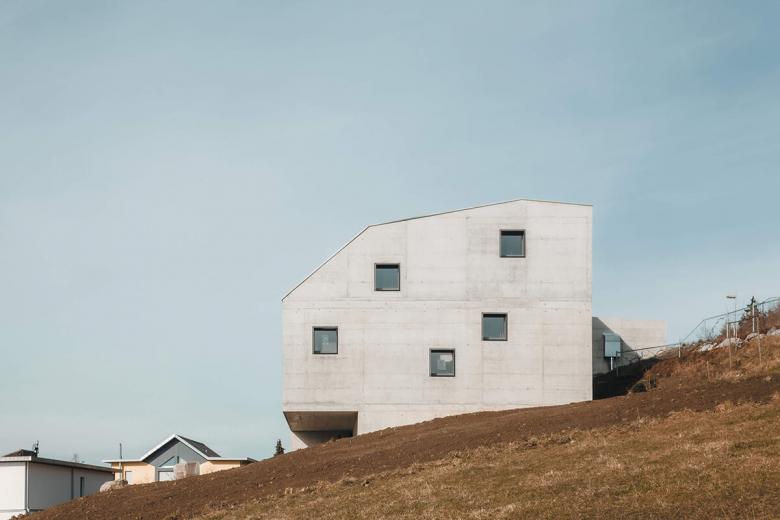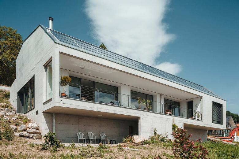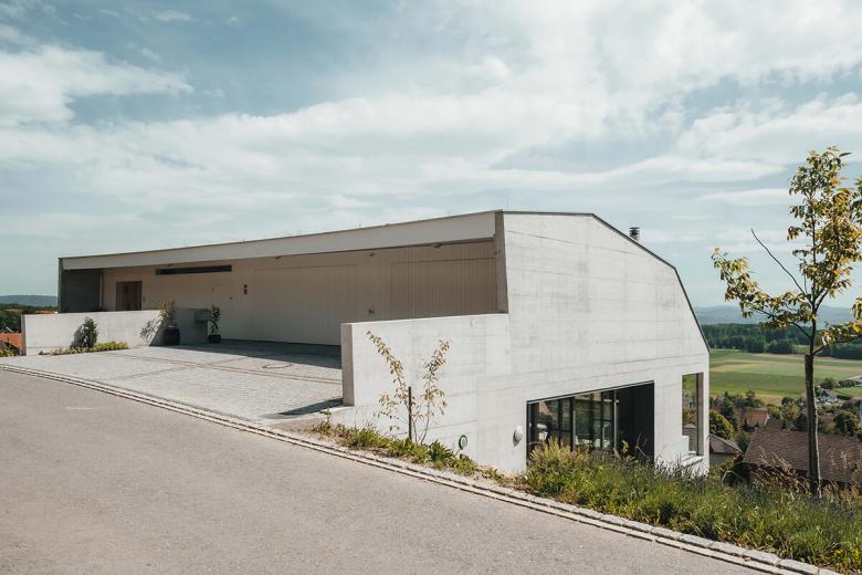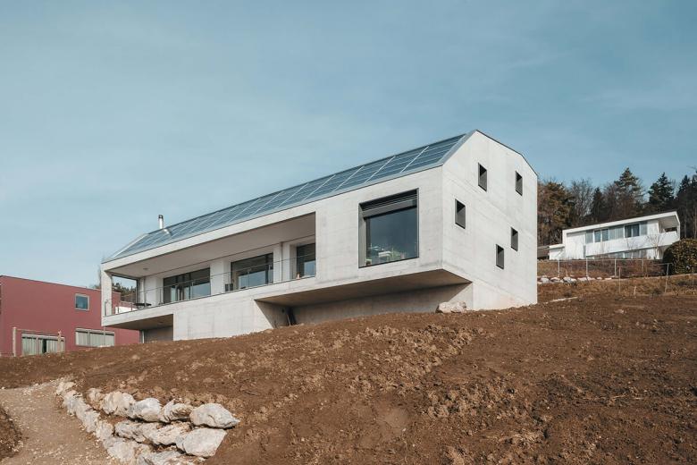 Ein Minergie-P Gebäude in Sichtbeton. Garageneinfahrt und Nebenräume im Obergeschoss, darunterliegende barrierefreie Wohnung mit grosszügiger Terrasse und Weitblick in die Berge. Unter der speziell geformten mit Photovoltaik bestückten Dachfläche ergibt sich ein grosszügiger Stauraum für die Oldtimer-Sammlung der Bauherrschaft.