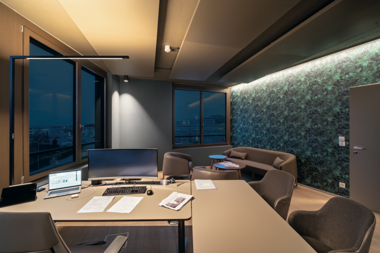 „Digitalisierung, Globalisierung, neue Technologien oder die gestiegene Mobilität – diese Veränderungen wirken sich auch auf die Art, wie wir arbeiten, aus und bedingen eine ganzheitliche Gestaltung und Strukturierung einer Büroumgebung“, führt Frey aus. So werden die weitläufigen Bürolandschaften in den oberen Etagen immer wieder von gemütlichen Break-Out-Inseln und Steh-Besprechungstischen unterbrochen. Im Erdgeschoss stehen Tagesgästen Co-Working-Arbeitsplätze und Besprechungsboxen zur Verfügung. Für eine normkonforme Arbeitsplatzbeleuchtung musste aufgrund der dunklen Decken und Materialien eine besonders leistungsfähige Lösung gefunden werden. In Form einer flexiblen Stehleuchte, so der Wunsch der Architekten. „Das war eine grosse Herausforderung, für die wir einen starken Partner gesucht und mit Zumtobel auch gefunden haben”, freut sich Stefan Sick über das Ergebnis. Die Beleuchtungsstärke der LINETIK Stehleuchte lässt sich darüber hinaus von jedem Mitarbeiter auf das gewünschte Niveau dimmen. Und nach der Arbeit können die Mitarbeiter den hauseigenen Fitnessraum nutzen, der mit einem Mix aus Spots, Lichtlinien und dekorativen Ringleuchten inszeniert wird.
